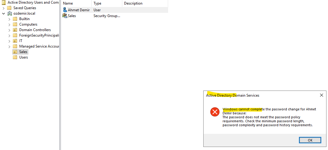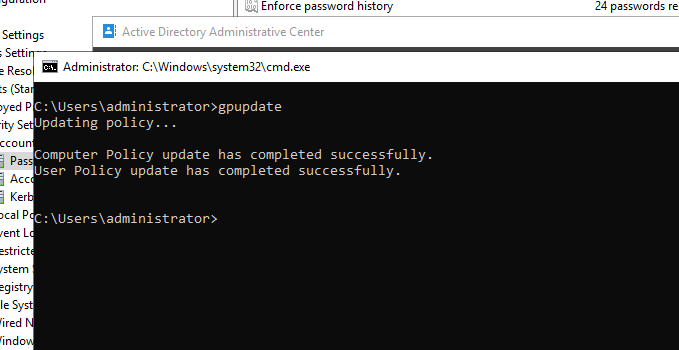 Evet Password Policy’imiz ve bu Password Policy’ye bağlı grubumuz gördüğünüz gibi aşağıda tanımladık. Şimdi gerekli testlerimiz yapalım. Ama öncesinde gpupdate ile policy’lerimiz update edelim.
