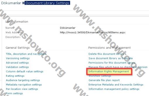 Makalenin birinci kısmında IRM korumasının döküman kütüphanesi düzeyinde sağlanabileceğini belirtmiştik. Dolayısı ile IRM enabled hale getirmek istediğiniz her Döküman Kütüphanesi için ayarları ayrı ayrı yapmanız gerekmektedir.Bu işlem Document Library Settings / Permissions and Management / Infırmation Rights Management menüsü altından yapılmaktadır.