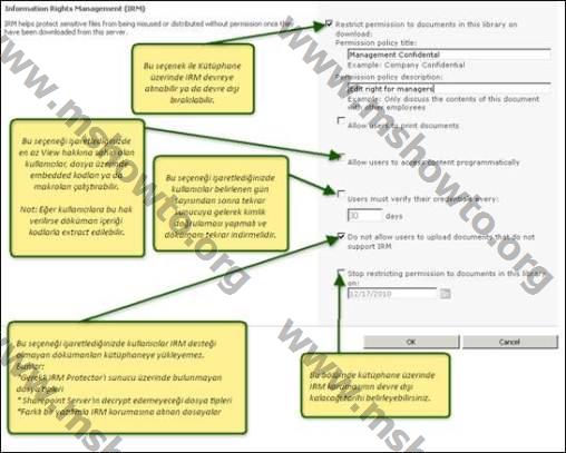 Bu menü bizi IRM ile ilgili ayarları yapabileceğimiz ekrana getirir.
