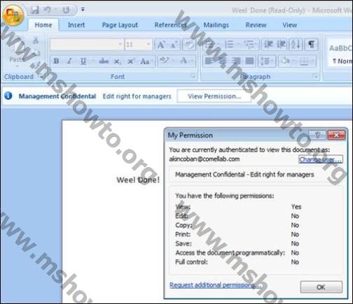 Akın kütüphaneden dosyayı indirdiğindeAD RMS’e bağlanarak kimlik doğrulaması yapacak ve ilgili haklar döküman üzerine kalıcı olarak uygulanacaktır.