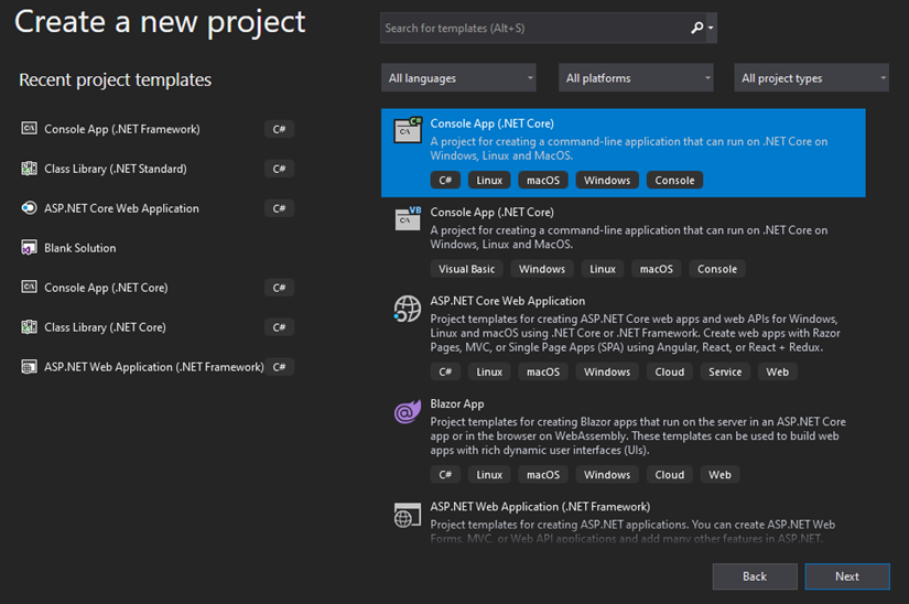 .Net Console App projesi seçelim ve Next seçeneği ile devam edelim.