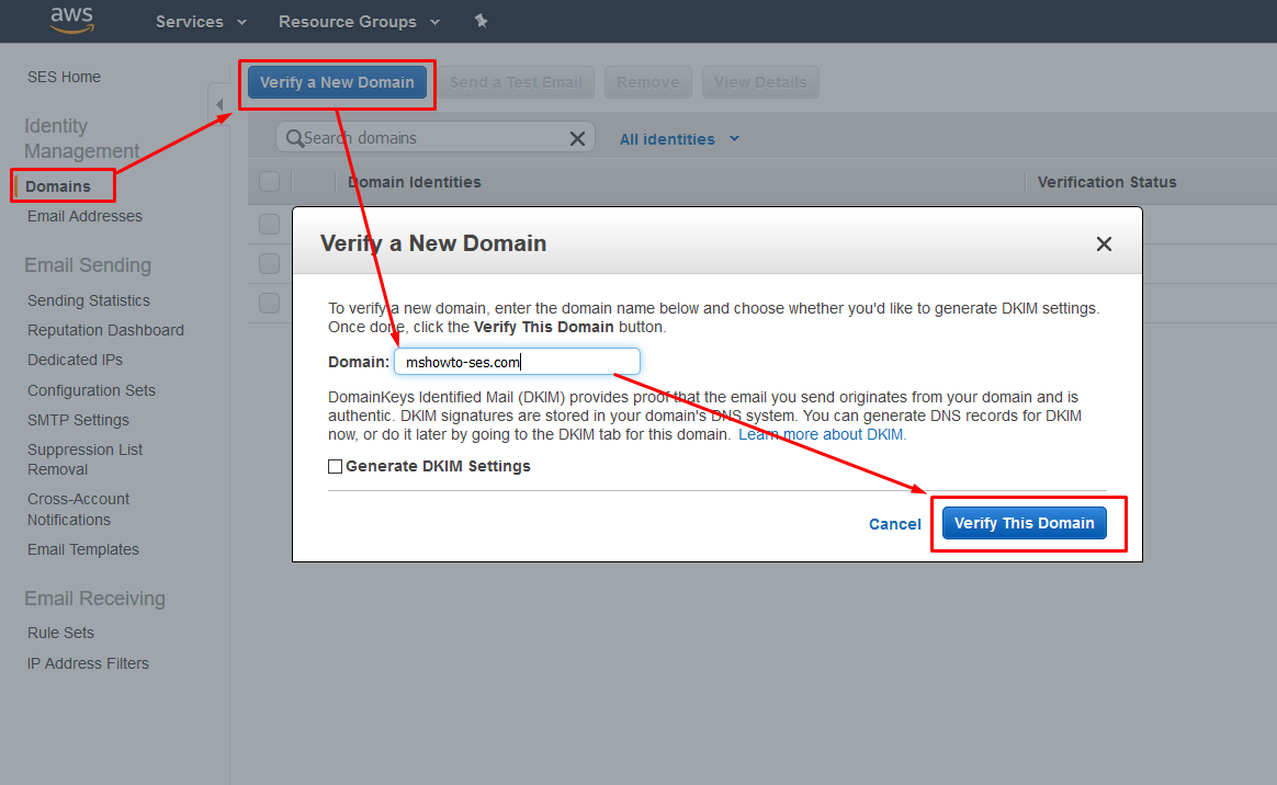 Domains bölümünü seçip Verify a New Domain butonuna basın. Açılan ekranda Domin: alanına doğrulamak istediğiniz adresi yazarak Verify This Domain butonuna basıyoruz. (Resim-2)