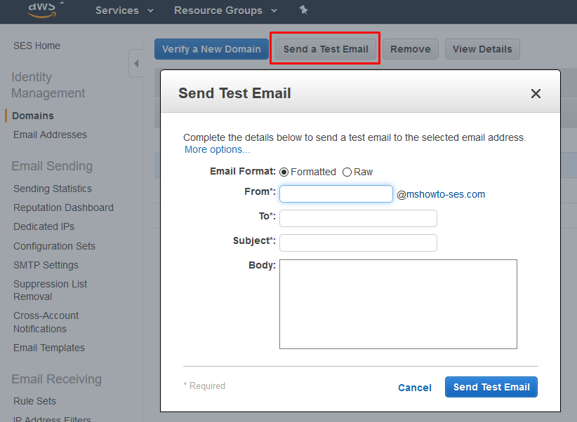 Amazon SES konsolundaki Send a Test Email butonunu kullanarak bir test e-mali gönderebilirsiniz (Resim-4). Yeni bir kullanıcı olarak, hesabınız SANDBOX alan adı verilen bir test ortamında olduğundan, yalnızca doğruladığınız domain adreslerine e-posta gönderebilirsiniz.