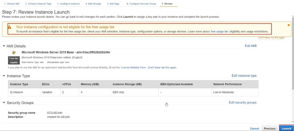 - Bu adımda oluşturmakta olduğumuz sunucunun güvenlik/erişim ayarlarını yapılandırıyoruz. “Create a new security group” seçeneğini işaretleyerek sunucu firewall kurallarını belirliyoruz. Bu sunucuya uzak masaüstü bağlantısı yapacağım için 3389 RDP portunu aktifleştiriyoruz. İkinci kural olarak Directory servisi tarafından otomatik oluşturulan güvenlik grubuna “All traffic” yetkisini tanımlıyorum. Burada tüm portlar açık olmasın derseniz sadece Active Directory tarafından ihtiyaç duyulan (SMB: port 445 TCP, UDP, Kerberos: port 88 TCP, UDP, LDAP: port 389 UDP, DNS: port 53 TCP, UDP vb.) portlara da izin tanımlaması yapabilirsiniz. Firewall kurallarını oluşturduktan sonra “Review and Launch” butonu ile sonraki adıma geçiyoruz.