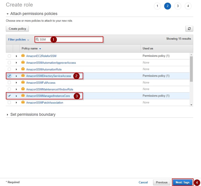 - Açılan izinler sayfasında arama çubuğuna “SSM” yazarak filtreleme yapıyoruz. Listelenen seçeneklerden “AmazonSSMDirectoryServiceAccess” ve “AmazonSSMManagedInstanceCore” seçeneklerini aktifleştirip “Next:Tags” butonu ile sonraki adıma geçiyoruz.