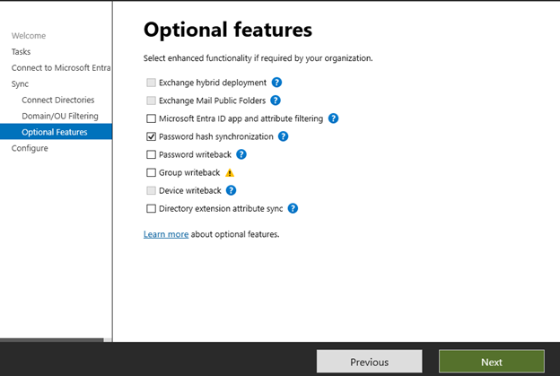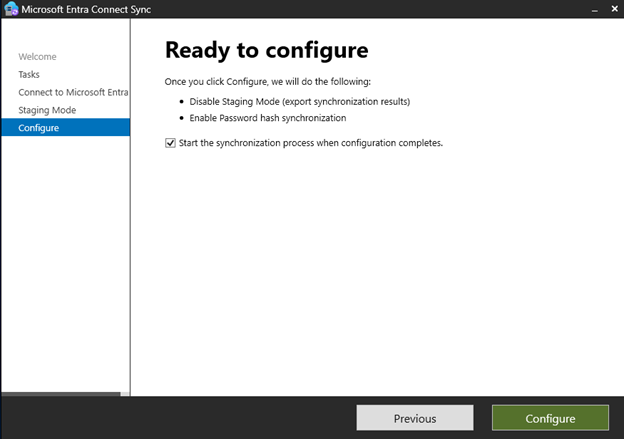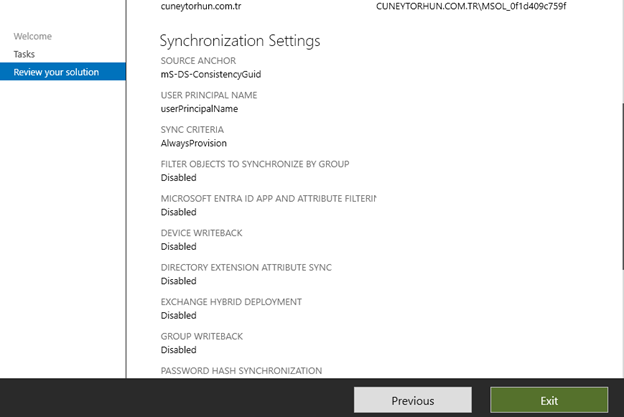 Ve kurulum tamamlanıyor. Arka planda sync işlemi başlatıldı. Fakat Entra ID ye henüz gönderilmeyecek. Entra Connect sync edilen objeleri üzerine alıyor şu anda. Ne zaman staging mode disable edersek o zaman sync olan objeler Entra ID ye iletilecek.