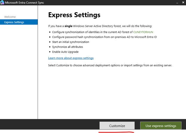 Burada indirdiğimiz dosya AzureADConnect.msi isminde. Programda da bazı yerler Azure AD Connect ismi ile devam ediyor.  Bu kafanızı karıştırmasın.