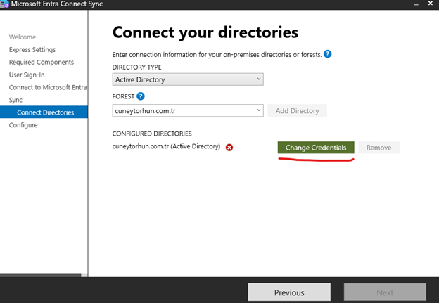 İşlem sonrası Sync yapmak isteyip istemediğimi soruyor evet diyip devam ediyorum. Artık bu aşamada üzerine aldığı değişiklikleri Entra ID ye gönderecek.