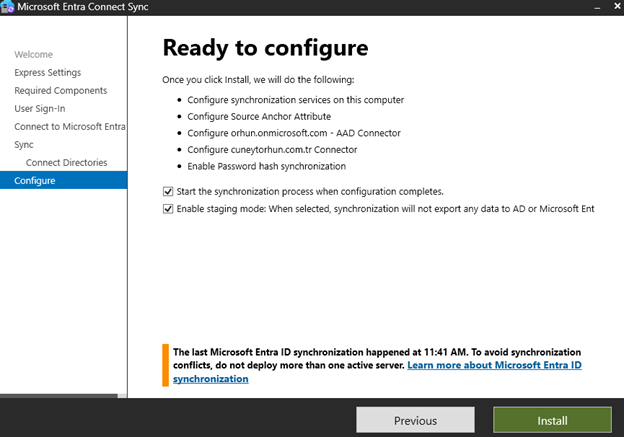 Şimdi en önemli noktalardan birine geldik. Aşağıdaki ekranda Start the sync seçeneği ve Enable staging mode u seçiyoruz. Staging Mode u enable ederek Entra Connect’in devreye girmesini önlüyoruz. Kurulum sonrası Azure AD Connect’I staging’e alıp bu sunucuyu yani Entra Cpnnect’i devreye alacağız.