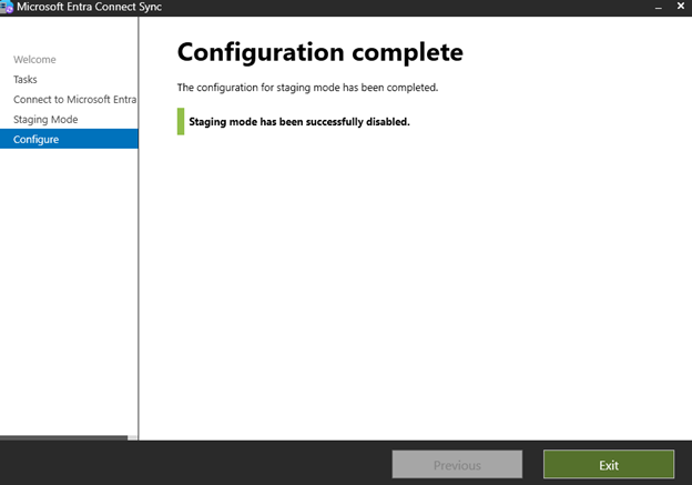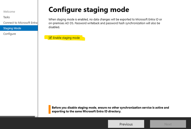 Enable staging mode seçeneğini seçip ilerliyoruz. Böylelikle Azure AD Connect devreden çıkıyor ve Sync işlemini durduruyor.