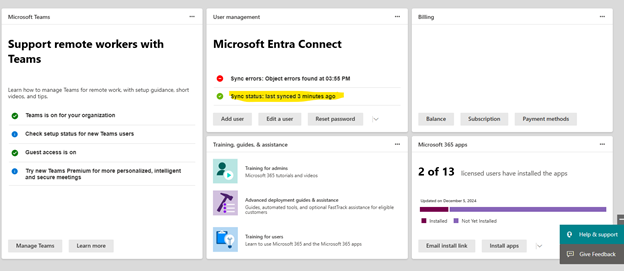 Office 365 portalıma baktığım zaman son eşitlemenin 3 dk önce gerçekleştiğini görüyorum. Yukarıdaki hata eski Azure AD Connect’den geliyor. Azure AD connect’i uninstall ettikten sonra o hata da kalkacak.