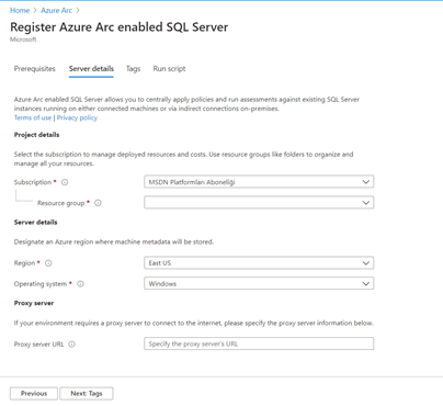 Server details kısımında region bilgisi ve işletim sistemi bilgisi isteniyor. Şuan için Azure Arc SQL Server’ın kabul ettiği region bilgileri aşağıdaki gibidir.