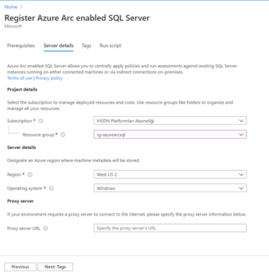 Resim-7: Register Azure Arc SQL Server – Bilgi girişi yapılmış hali