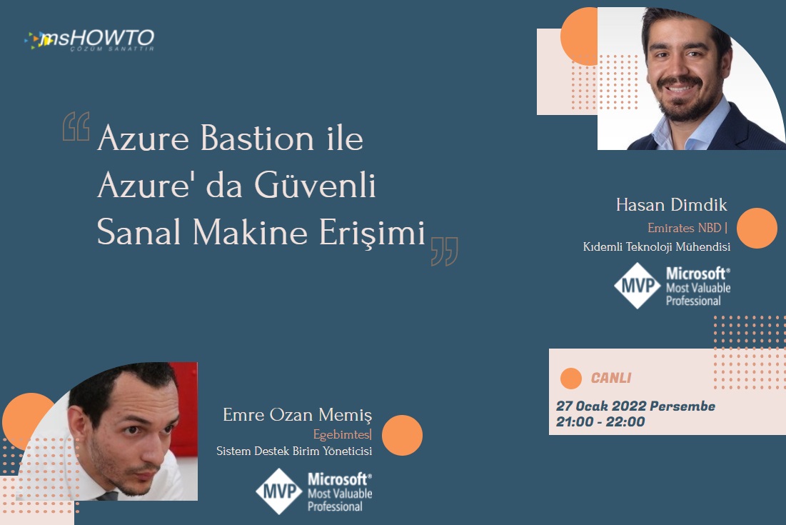 Mshowto yazarları ve Microsoft MVP‘leri Emre Ozan Memiş ve Hasan Dimdik 27 Ocak 2022 Perşembe akşamı saat 21:00‘da sizlere daha güvenli uzaktan erişim ile Azure sanal makinelerinizi nasıl koruyacağınızı aktaracaklar. Sizleri de bu webinar’da görmekten mutluluk duyacağız.