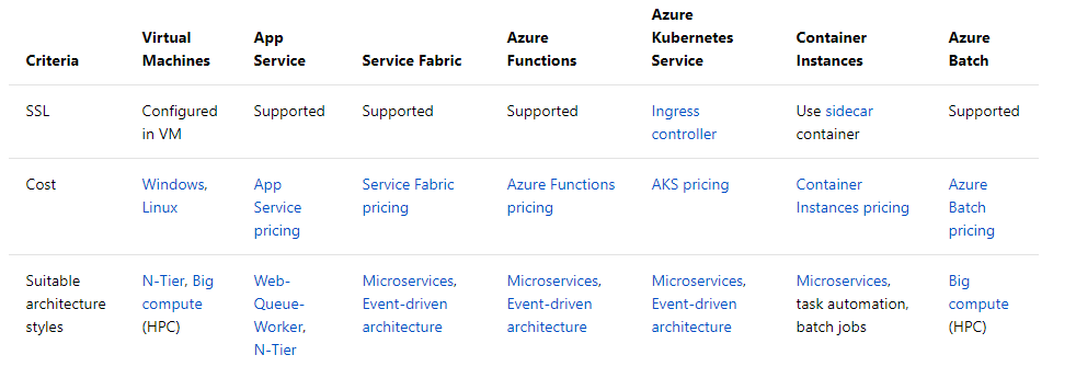 Önceki makalede Azure Compute Hizmetleri için Karar Ağacından bahsetmiş son bölümde seçim sırasında dikkat edilmesi gereken kriterleri inceleyeceğimizi söylemiştim. Compute terimi aslında uygulamalarınızın üzerinde çalıştığı hesaplama kaynakları için barındırma modelini ifade eder. Aşağıdaki tablolar Azure Compute hizmetlerini birkaç eksende karşılaştırmaktadır. Uygulamanız için bir compute seçeneği belirlerken bu tablolara bakmanızı şiddetle öneririm.