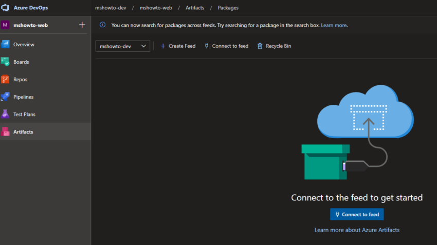 Paket kaynağını nuget.org ya da kendi NuGet paketleriniz için kullandığınız local bir NuGet server kullanmışsınızdır. Azure Artifacts’ı aslında size özel bir NuGet server olarak da nitelendirebiliriz. Azure DevOps ekranında menüden Artifact’a geldiğinizde size varsayılan olarak bir feed oluşturduğunu görebilirsiniz (Resim-1).