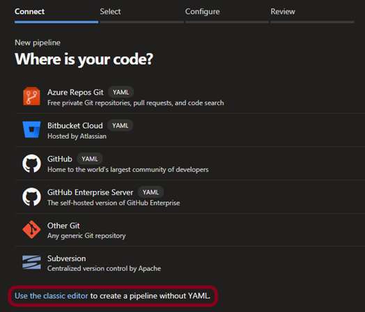 Azure DevOps, bir pipeline oluşturabilmemiz için Classic Editor‘un yanında build ve release süreçlerini basitleştirmek için bir YAML tasarımcısı sağlar. Biz bu demo’da Classic Editor ile devam edeceğiz.