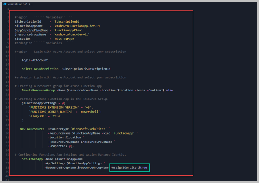 Fonksiyonumuzu deploy etmeden önce bildiğiniz gibi Azure Subscription içerisine Azure Function App deploy etmemiz gerekiyor. Bunu dilerseniz Azure Portal, ARM Template, VSCode, Powershell yapabilirsiniz. Bu yazı içerisinde size aşağıdaki Powershell Script’ini takip ederek Azure Function App oluşturmanızı yardımcı olacak olan kod bloğunu paylaşıyorum.