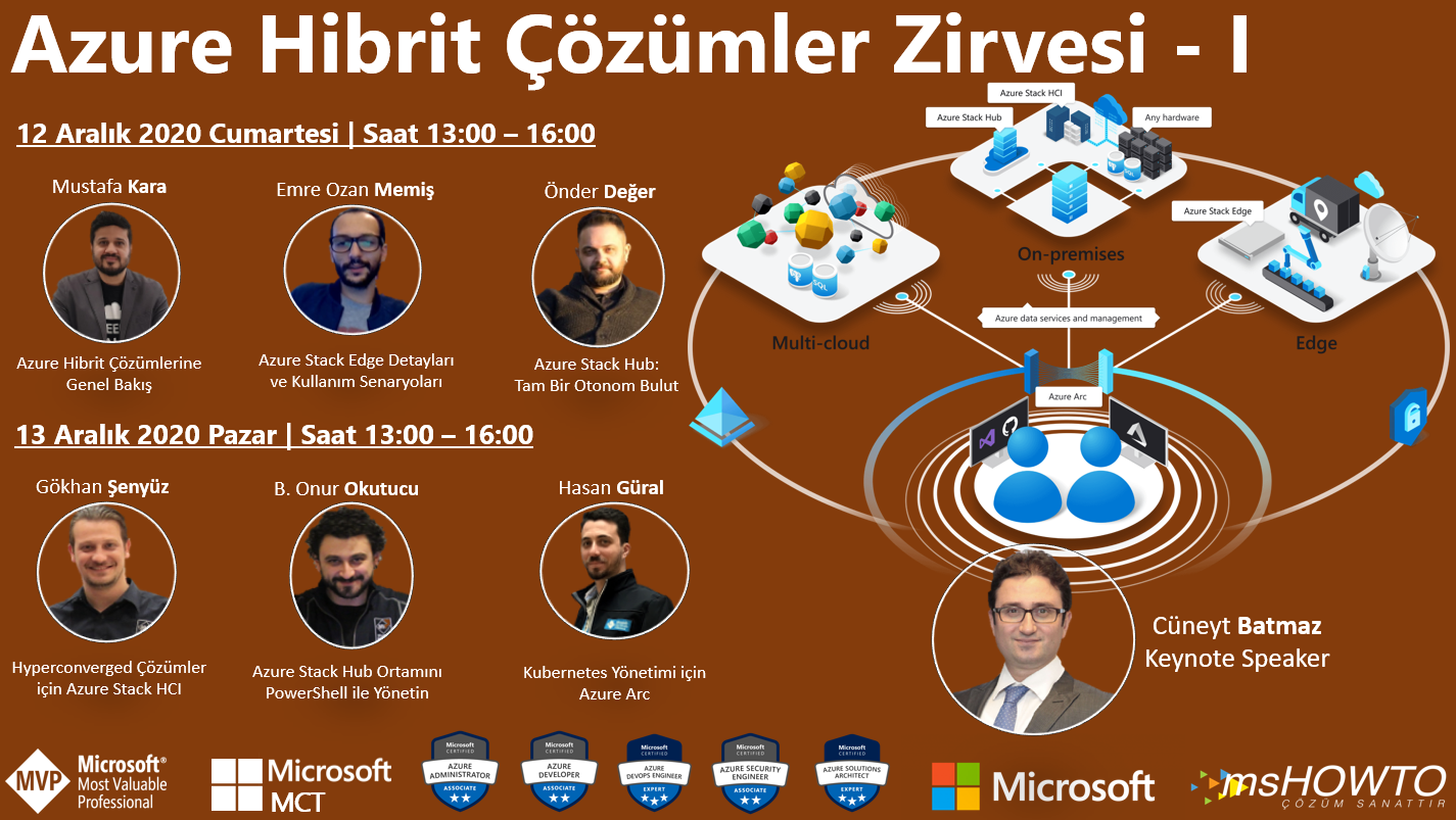 MSHOWTO Topluluğu olarak Azure Hibrit Çözümlerini ve bu vizyonda kurumlarınızın hizmetlerine sunulan platformları Aralık ayında 2 farklı hafta sonu toplam 4 gün boyunca 12 uzman 12 farklı Azure Hibrit Çözümünü sizlere aktarıyor olacaklar.