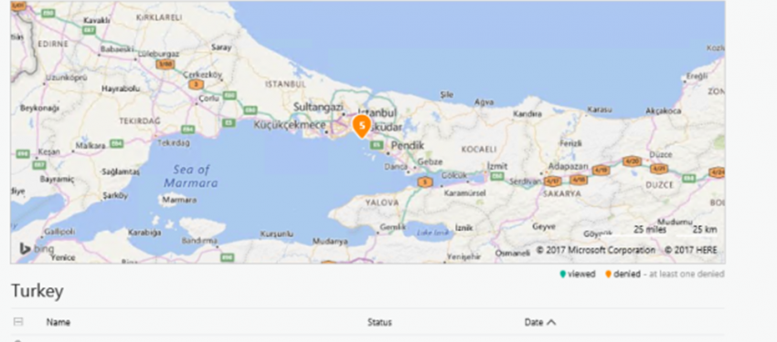 Trace ederken dökümanın kim tarafından, hangi aksiyonu alarak erişmeye çalıştığı, erişim bilgisi ve bu girişimlerin hangi zaman diliminde olduğunu tarih ve saat olarak görebiliriz. Hatta belgeye erişim sağlayan ve ya sağlamaya çalışan kullanıcıların hangi lokasyon üzerinden erişmeye çalıştıklarını da Map özelliği ile görebilirsiniz.