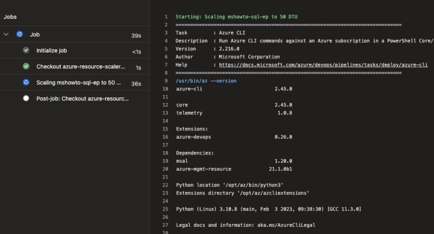 Pipeline oluşturma ve trigger ayarları ilk bölüm ile aynı olduğu için tekrar o kısımlardan bahsetmeyeceğim. Son olarak da az sql elastic-pool update komutuna ilgili parametreleri geçerek çalıştırıyorum.