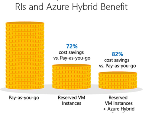 Öncelikle Reserved VM instance, Windows ve Linux sanal makineleri 1 veya 3 yıllık dönemlerde rezerve ederek pay-as-you-go fiyatlarına göre 72%’ye varan maliyet avantajı yakalamanızı sağlayan bir çözüm. A, Av2 ve G serisi makinalar haricindeki tüm VM’ler için Azure RI kullanımı yapmak mümkün.AHUB ile birleştirildiğinde 82%’ye varan maliyet avantajıyla Azure, Windows Server iş yükleri için en uygun maliyetli genel bulut çözümü haline geldi.