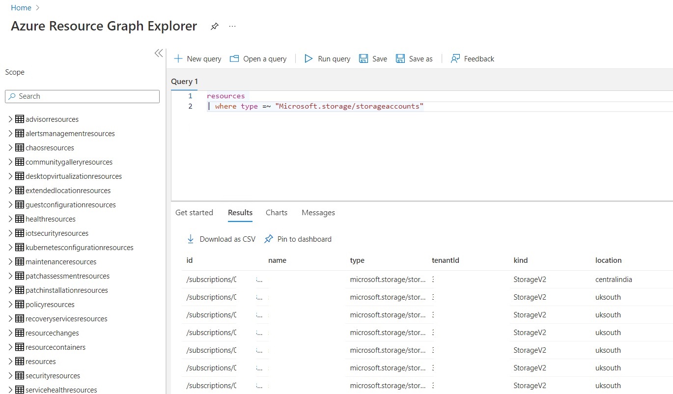 Yaptığımız yukarıdaki örnekte **resources** tablosu içerisinde bulunan ve tipi storageAccounts ile aynı olanları getirmesini istedik. Filtreleme için `where` operatörünü kullandık ve ilgili resource tipine eşit ise bize tüm storage hesaplarını döndürmesini istedik. Unutmayın ki sadece `Reader` hakkımız olan storage hesaplarını listeleyebiliriz. Örneklerimizi çoğaltalım.