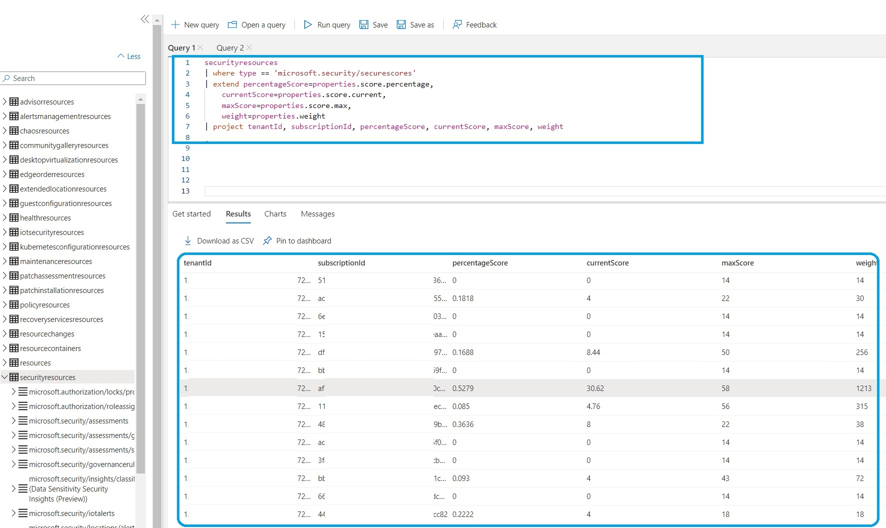 | project tenantId, subscriptionId, percentageScore, currentScore, maxScore, weight