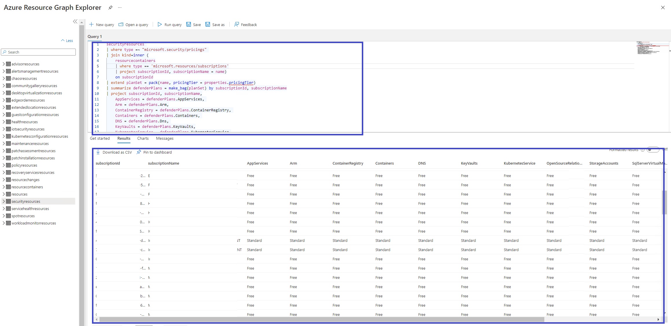 Azure Defender for Cloud üzerindeki servislerini kullanıyo veya kullanmak istiyor olabilirsiniz. Defender for Cloud, gelişmiş güvenlik özellikleri ve hizmetleri aracılığıyla Azure, diğer bulut hizmetleri ve şirket içindeki kaynakları korumanıza yardımcı olur. Bu servisleri kaynak modeline göre sunmaktadır. Aşağıdaki sorguyu kullanarak cok kolay bir şekilde abonelik seviyesinde hangi servislerin aktif edildiğinin veya şuan bulunan ortamınızın envarter raporunu alabilirsiniz.
