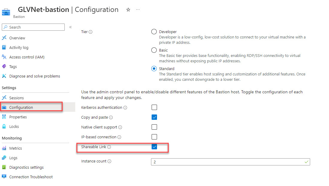 Son bir bilgi daha vererek Azure Bastion Shareable link’i etkinleştirmek, oluşturmak ve kullanmak için aşağıdaki adımları sizlerle paylaşmaya devam edeceğim. Temel Azure Bastion ayalarınızı zaten en doğru şekilde yapmanız bunun dışında kullanmış olduğunuz Azure Bastion SKU’sunun standard tier olması gerekmektedir.