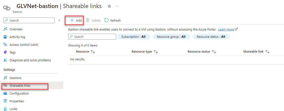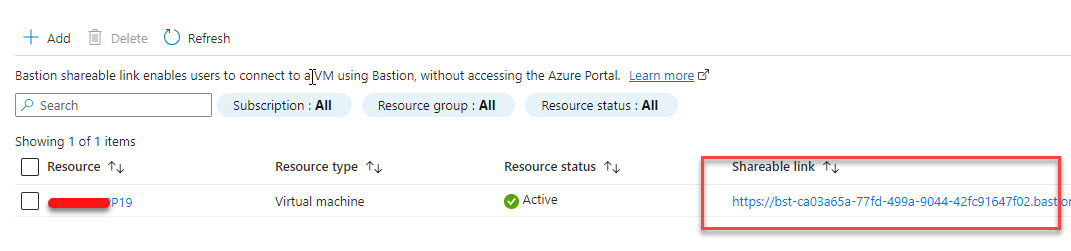 Azure Bastion settings altında artık shareable link’in oluştuğunu göreceksiniz, tıklayın ve Add butonuna basarak shareable link oluşturmayı tamamlayacağız.