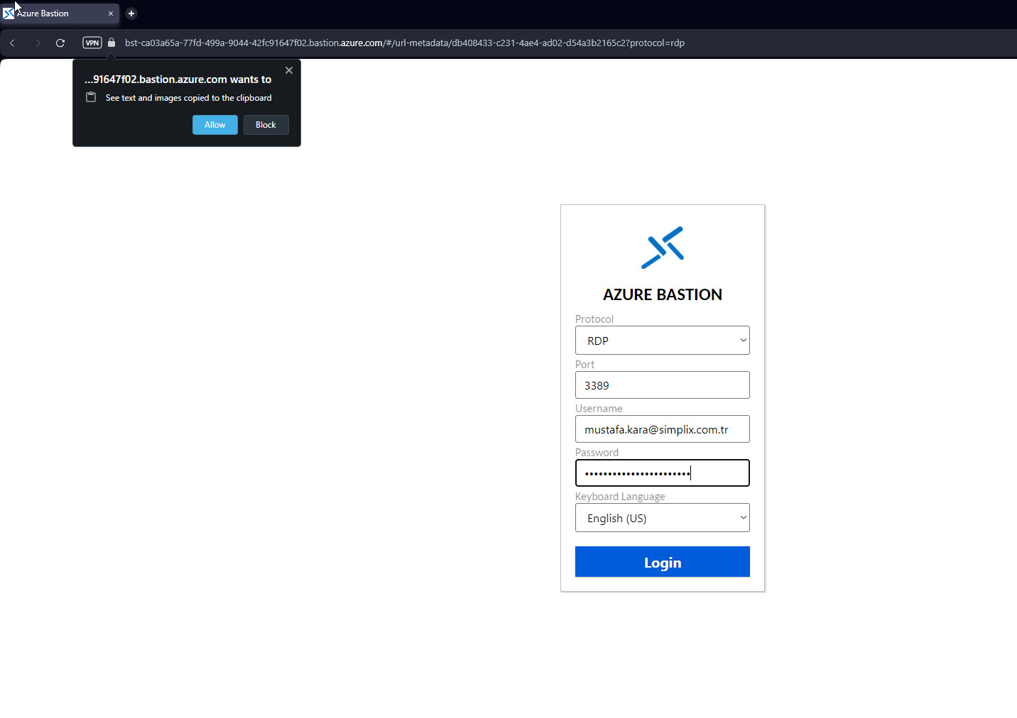 Linki herhangi bir browser’da açtığınızda aşağıdaki gibi Azure Bastion ekranının geldiğini görebileceksiniz.