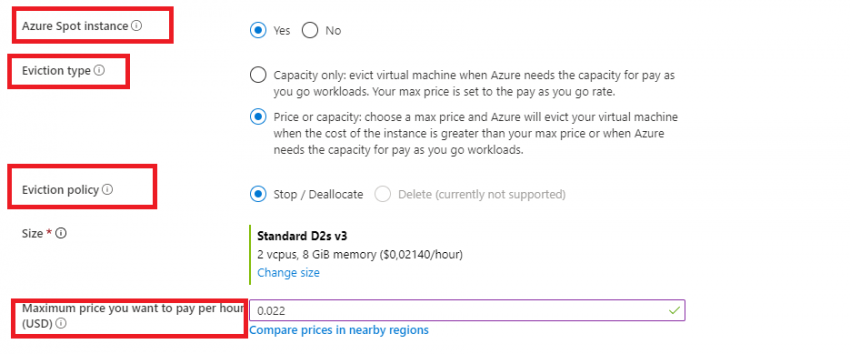 - Price or Capacity: Burasını seviyorum 5 haneli saatlik bir fiyat belirliyorsunuz (Bu fiyatı Maximum price you want to pay per hour alanına giriyorsunuz) ve bu sizin bu sanal makine için vermiş olduğunuz en yüksek fiyat oluyor. Sanal makinenin fiyatı vermiş olduğunuz en yüksek fiyattan daha fazla olursa veya Azure kapasiteye ihtiyaç duyarsa sizi bu sanal makine kullanımdan tahliye ediyor.