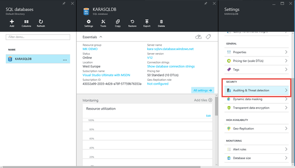 Oluşturmuş olduğunu SQL Database tıklayın, Settings tıklayın ve Auditing & Threat Detection seçin.
