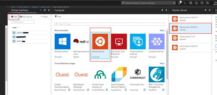 Azure Portal üzerine login oluyorum ve kendi aboneliğim aldığında bir adet Ubuntu Server 16.04 LTS image’nı seçiyorum. Bu adımları detaylıca anlatmak istemiyorum, artık herkesin Azure üzerinde VM oluşturabilidiğini düşünüyorum. İlk defa yapacak olanlar aşağıdaki ekran görüntüsünde kırmızı kutular içine aldığım ikonları tıklayarak sırasıyla yapabilirler.