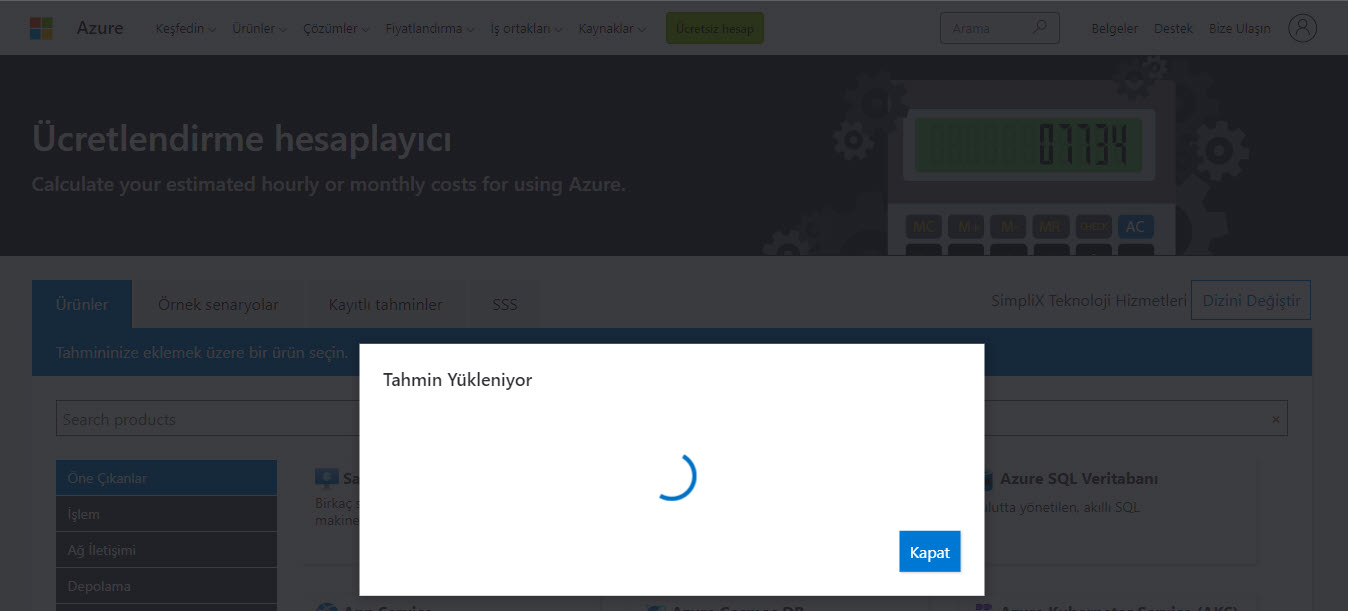 Linke tıkladıktan kısa bir süre sonra tahminleme yükleniyor, eğer oturum açmadıysanız oturum açmanızı isteyecektir. Ben diğer müşterilerimize Azure fiyatlaması çalışması yaptığım için ilgili browser’da oturum açmış durumdayım bu yüzden benden istemedi.