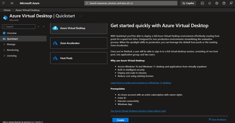 20 Mart 2025 tarihinde Microsoft, Azure Virtual Desktop ekranına Quickstart sekmesi eklenmesi ile birlikte VDI kurulumlarını daha pratik bir biçimde sürdürmeyi sağladı. Bu yenilik ile daha çok test ve PoC ortamlarına uygun hızlı ve pratik bir biçimde VDI sanal sunucuları oluşturmayı sağlıyor. Quickstart ekranına geldiğinizde VDI ortamı hazırlamak için Create butonu üzerinden ilerleyip sanal sunucularınızı veya host pool’larınızı oluşturabilirsiniz.