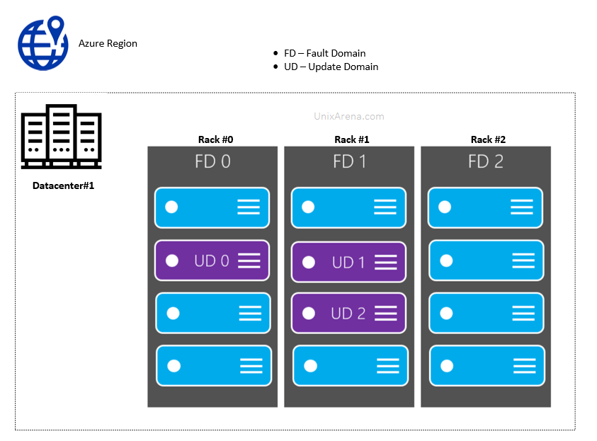 Her bir availability set en fazla 3 Fault Domain ve 20 Update Domain ile yapılandırılabilir. Oluşturulduktan sonra değişiklik yapılamaz. Fault domain sunucuya gelen elektrik ve internet kesintisine karşı bir önlemdir. Eğer FD0 da bir kesinti olursa FD2 de bulunan iş yükleriyle kesintisiz devam edebilmektedir. Sunucuların yamalarını ve yazılım güncellemeleri sonrasında sunucuların yeniden başlatma gereksinimi olabilir. Bu durumda mantıksal gruplar olan Update domain ortaya çıkmaktadır. Eğer güncelleştirme ve restart gerekiyorsa UD1 de güncelleme ve restart işlemi yapılmaktadır bu sırada UD2 den devam eder iş yükleri.