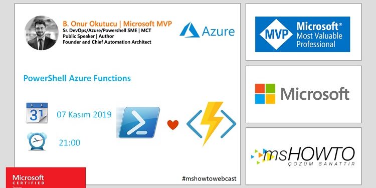 Onursal üyelerimizden ve yazarlarımızdan Sevgili Baki Onur Okutucu‘nun sizler için hazırlamış olduğu Azure Webcast serisinin dördüncüsü 07 Kasım Perşembe günü saat 21:00’da gerçekleşiyor ve PowerShell ile Azure Fonksiyonları (PowerShell Azure Functions) anlatıyor.