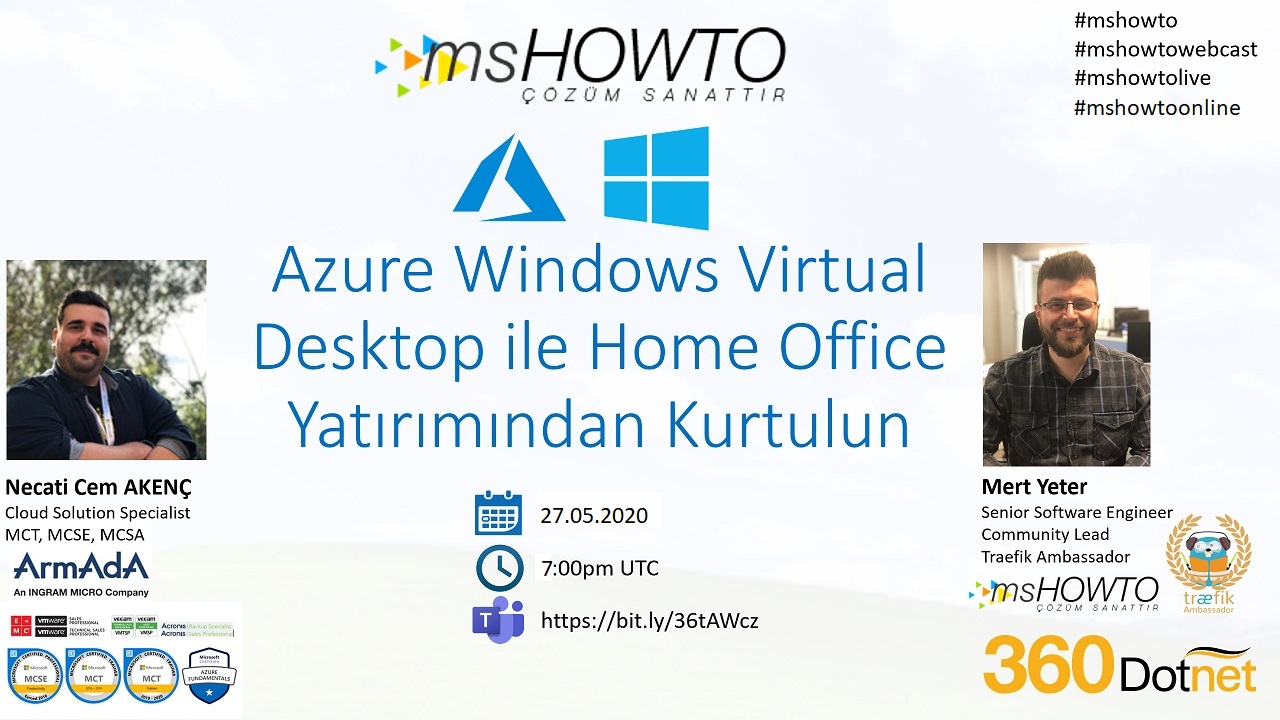 Mshowto Yöneticilerinden Mert Yeter ve Cloud teknolojilerinde uzman yazarlarımızdan Necati Cem Akenç sizler için uzaktan çalışmanın en hızlı ve en güvenli yöntemlerinden birisi olan Azure Windows Virtual Desktop konusuna 27 Mayıs 2020 Çarşamba günü saat 19:00‘da uçtan uca değinecekler.