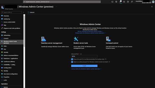 Konumuza gelirsek Azure’da kullandığınız sanal makinelerden özellikle Windows Server’lardan birisine gelip, sanal makine ayarlarına geldiğinizde Windows Admin Center(preview) göreceksiniz. WAC’ı ilgili sanal makineye yüklemek için Install butonuna tıklamanız yeterli, default port olan 6516’yı değiştirmek isterseniz yine buradan değiştirebilirsiniz. Install’diyerek bu adımı geçiyorum.