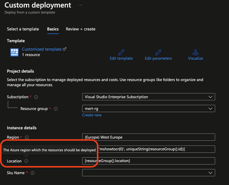 İlk önce ilk sorundan başlayalım. Parametrelere varsayılan bir değer atayabiliyoruz. Hatta bunun için ileride detaylarına gireceğim hazır fonksiyonları da kullanabiliyoruz. Örnek olarak location bilgisi için resource group’un olduğu location bilgisini kullanmak istiyorum, resource group ile içerisinde yer alan resource’ların farklı bölgelerde olmasına gerek yok. Eğer bu template’i farklı bir resource group ile çalıştırırsam, “parametre olarak ne geçeceğim bir bakayım” ya da “default değeri de değiştirmem gerekli” gibi sorunlardan kurtulmuş oldum (Resim-5).