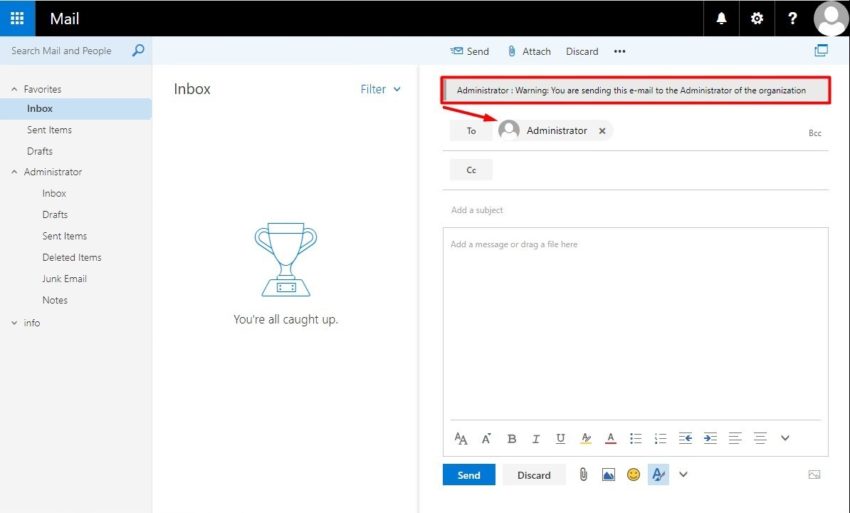 Örneğin aşağıdaki komut şirket Administrator hesabına “Warning: You are about to send this e-mail to the Administrator of your organization.” mailtip’ini ekler.