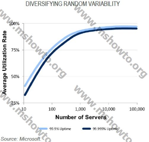 Microsoft tarafından; talebin rastgele değişkenliğinin buluttaki sunucu sayısı artırılırken sunucu kullanım üzerine olan teorik etkisini modelleyen bir çalışma gerçekleştirildi. Bu çalışmaya göre, teoride 1000 sunuculuk bir kaynak havuzunda hizmet standardı anlaşmasını ihlal etmeden %90’a varan kullanım oranına ulaşılabiliyor. Bu sonuç, yalnızca değişkenliğin tek kaynağının gelişi güzelik olduğu durumda ve iş yüklerinin fiziksel sunucular arasında herhangi bir kayıp yaşanmadan taşınabildiği durumda geçerlidir. Önemli olan nokta ise; daha yüksek kullanım oranlarının, kaynak havuzu büyüklüğünün arttıkça daha kolay sağlanabiliyor olmasıdır.