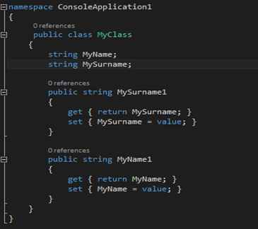 C# 6.0 ile gelen değişiklik ile sınıf içerisinde değişken tanımlamadan constructor içerisinde değişken tanımlaması yapabiliyoruz ve bunları kullanabiliyoruz. Default constructor içerisinde myname ve surname adında iki değişken yazıyoruz ve tanımlamamızı yapıyoruz.