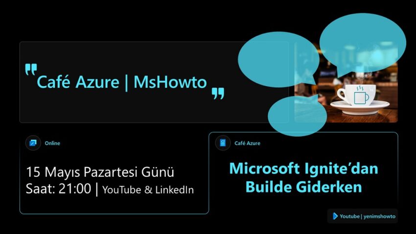 CafeAzure: Sektörün ileri gelenleri ile her hafta farklı konuları konuşacağımız online yayın formatında servis edilen yeni nesil içerik. Olmadı değil mi ? Biz her hafa bir araya gelip sohbet edemediğimizi fark edince café Azure yapalım yeni nesil teknolojileri, eğlenceli sektör deneyimlerimizi konuşalım istedik bunu da sizlerle paylaşmaya karar verdik. Her hafta yeni konu ve konukları ile Café Azure sadece mshowto youtube ve Linkedin kanalında canlı yayında.
