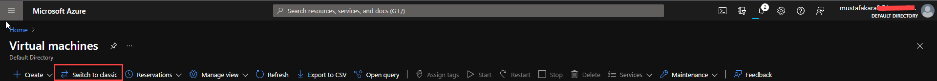 Azure Portal’dan sanal makinelerinizin Azure Hybrid Benefit durumunu görebilmek için ilk olarak yapmanız gereken Switch to classic yani klasik görünüme geçmeniz gerekmektedir. Bunu Resim-4’de gördüğünüz şekilde yapınız.