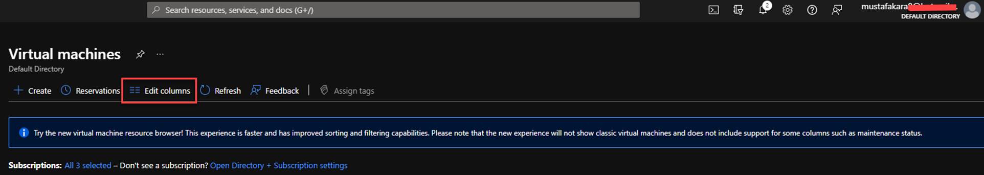 Öncelikle hangi sanal makinelerde Azure Hybrid Benefit etkin bunu görmek isteyebilirsiniz ve bunun içinde Azure portal’da Virtual Machines bölümene gelerek ne durumda olduğunuzu incelemek isterseniz varsayılan görünümde bu bilgiye sahip olamayacaksınız.