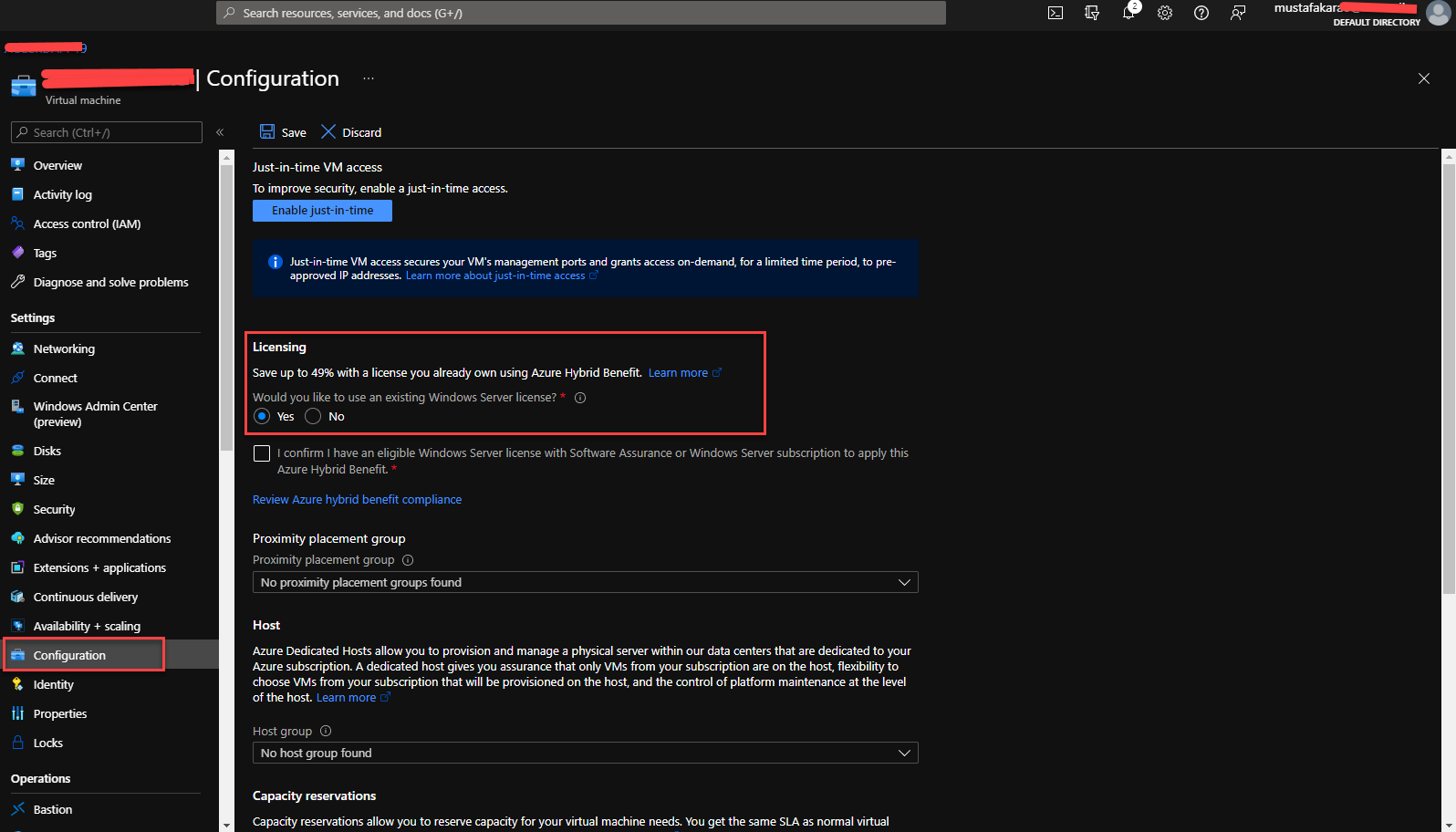 Son aşamaya geldik, etkin yazılım güvenceniz kapsamındaki çekirdek sayınıza göre AHB’u etkinleştirmek istediğiniz sanal makinenizin settings kısmında yer alan configuration bölümüne gelin. Sonrasında Licesing içerisinde varolan Windows Server lisansını kullanmak ister misiniz sorusunda eveti işaretleyerek, başvurunuzu teyit edin ve kaydet butonuna basın.