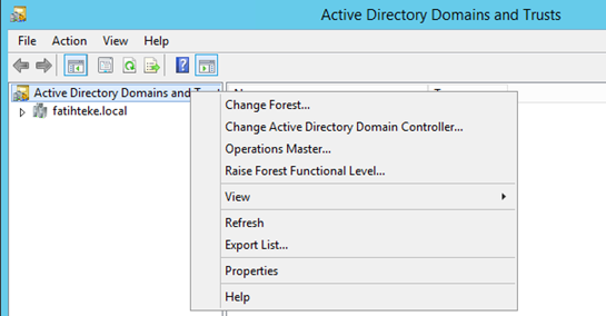 Domain Naming Master rolü Active Directory Domains and Trusts içerisinde yer almaktadır. Servis üzerinde sağ klik yapınız ve “Operations Masters” kısmını seçiniz.